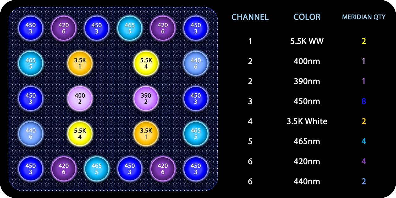 Designed with a high white to blue color ratio, based on the most popular lighting schedules created by Photon users. The original layout has an 18K blue look with all channels equal, and has 2 additional 440nm indigo LEDs on a dedicated control channel, for a total of 4 (vs. 2 x 440nm in the 14K layout).