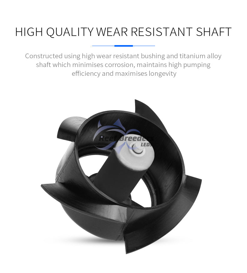 The RP-M V2 is about half the size of conventional powerheads with comparable output. For example, the QP-9 protrudes 3 7/8" into the aquarium, while the RP-M V2 protrudes only 2.25". How do we do this? Simple! Instead of using a conventional impeller which protrudes from the motor block and generates a narrow vortex that is directed through a nozzle, we redesigned the impeller to rotate around the motor block. This both reduces the size of the pump by nearly 50%, and produces an extremely wide yet powerful flow. This unique flow pattern is both powerful and gentle on corals. Corals all around your aquarium experience a gentle wave motion, and corals directly in front of your RP-M powerhead don't get blasted. Our new and improved impeller has more than twice the surface area of a conventional impeller with 4 blades instead of 2. This creates a more evenly distributed flow pattern and helps eliminate dead spots in your aquarium.