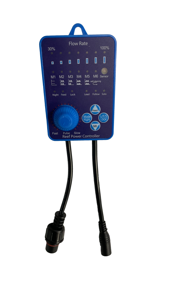 Every Reef Power RP-M V2 includes an intuitive controller packed with features. The controls were modified for ease of use and adjustability. Additional wording and icons were added in addition to eliminating the LCD screen. The Controller has a simplified interface that gives you relevant information at a glance. The flow rate is prominently displayed up top, and the pulse speed is adjusted with a knob. Each mode has an icon that shows an approximation of the pumps behavior in that mode. A night sensor is built in, as well as a feed timer, wireless linking, and a cleaning mode with reverse spin.